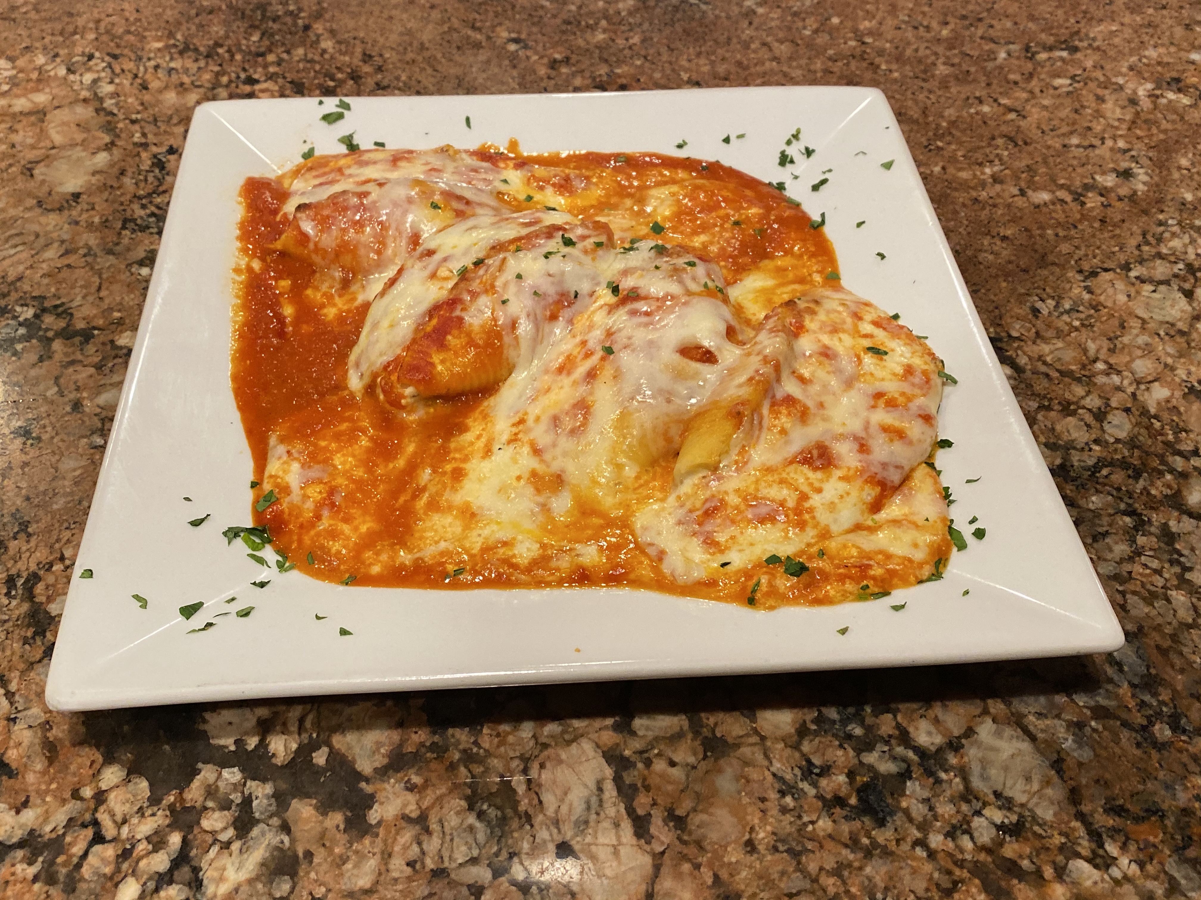 Fresh battered eggplant rolled with seasoned ricotta, baked "parmigiana Style" with tomato sauce and mozzarella cheese