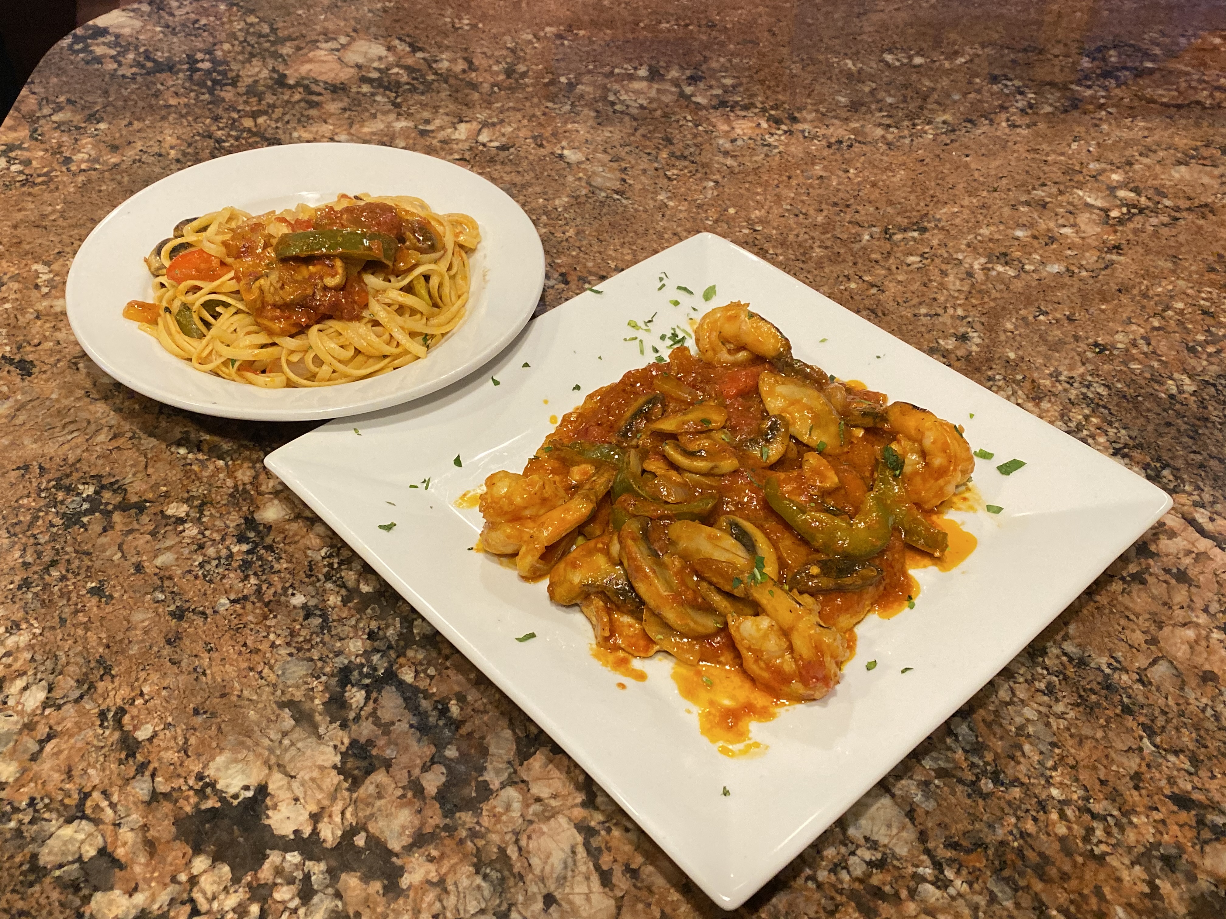 Sauteed shrimp in a spicy, garlic marinara sauce over linguini