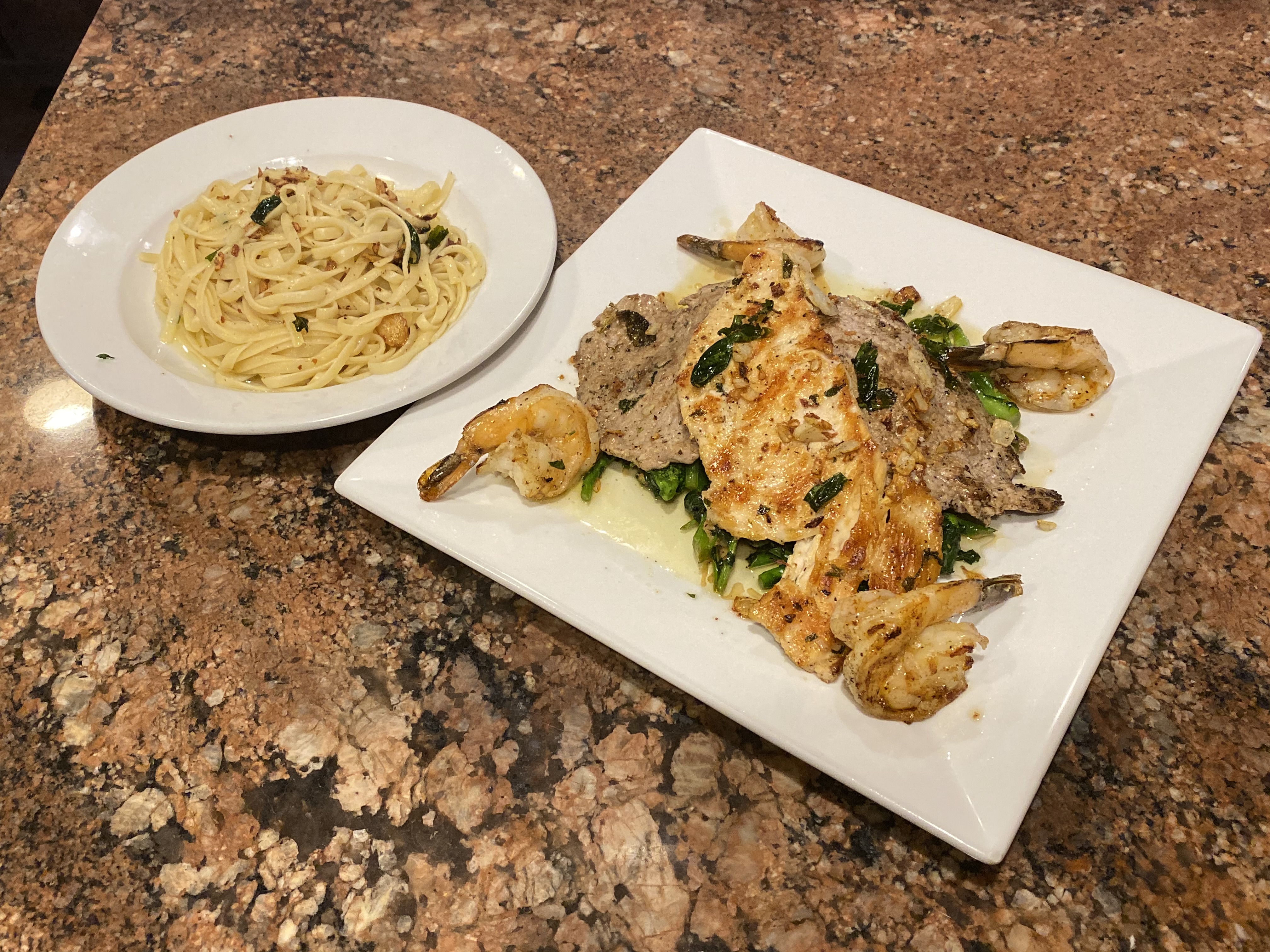 Mussels, clams, shrimp, and calamari over linguini in a marinara or spicy fra diavolo sauce